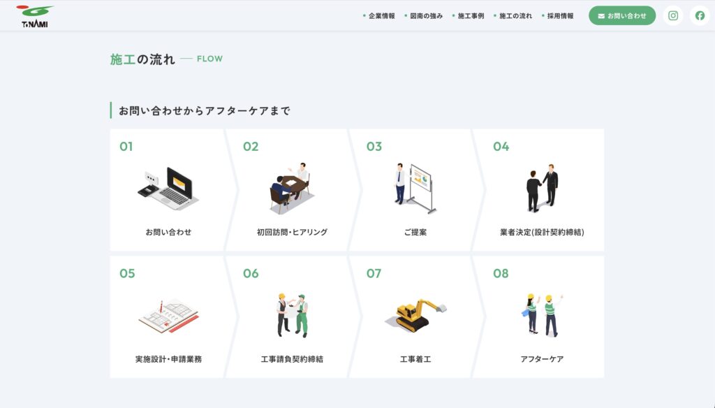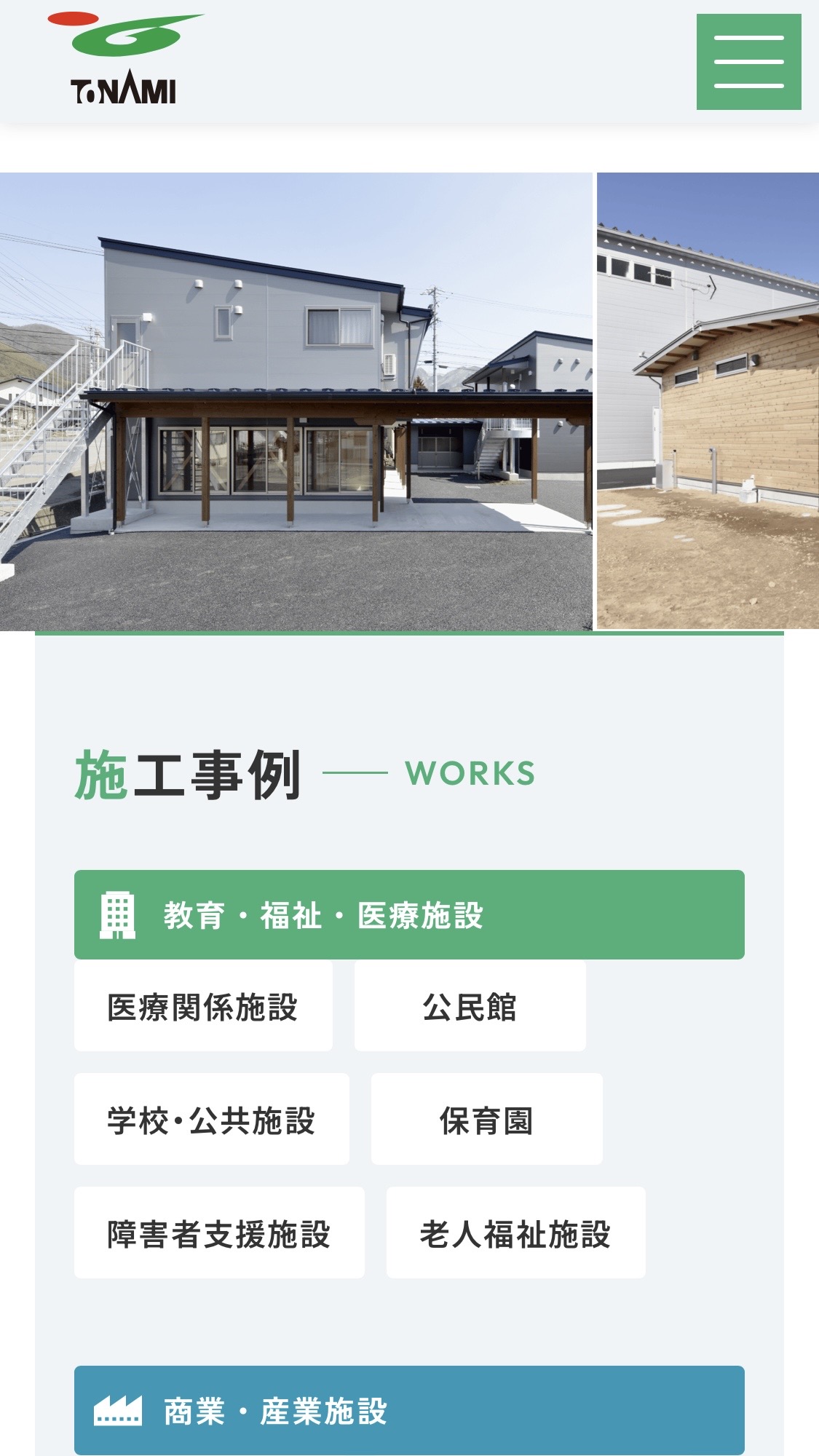 施工実績ページは、施設・住宅などのカテゴリごとに写真を大きく配置し、幅広い施工実績を直感的に把握できる構成に。